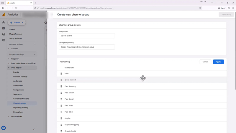 For ongoing reporting, create a custom channel grouping in Admin > Data settings so AI sources are classified as a top-level channel (e.g., “AI chatbots”). This surfaces AI traffic directly in Acquisition reports and makes it easier to compare channel performance side-by-side with Organic, Paid, Direct, and Referral.